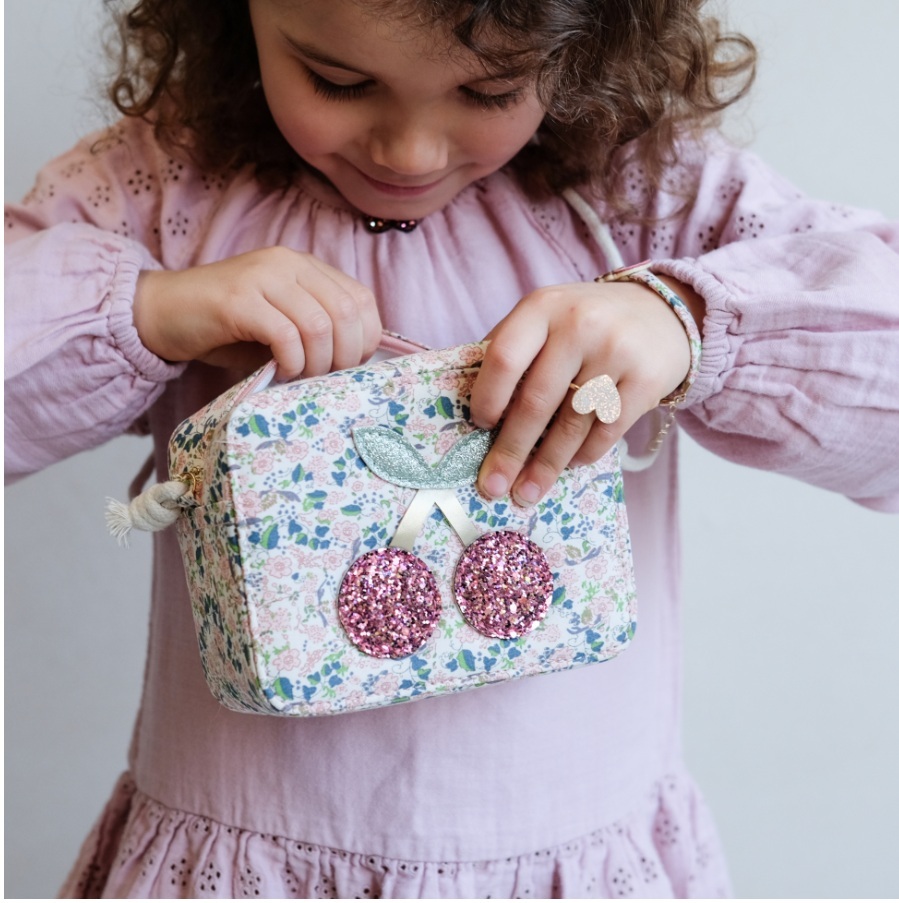 Vesela torbica izrađena od materijala cvjetnog uzorka sa svjetlucavom trešnjicom stvara pravu proljetnu čaroliju.