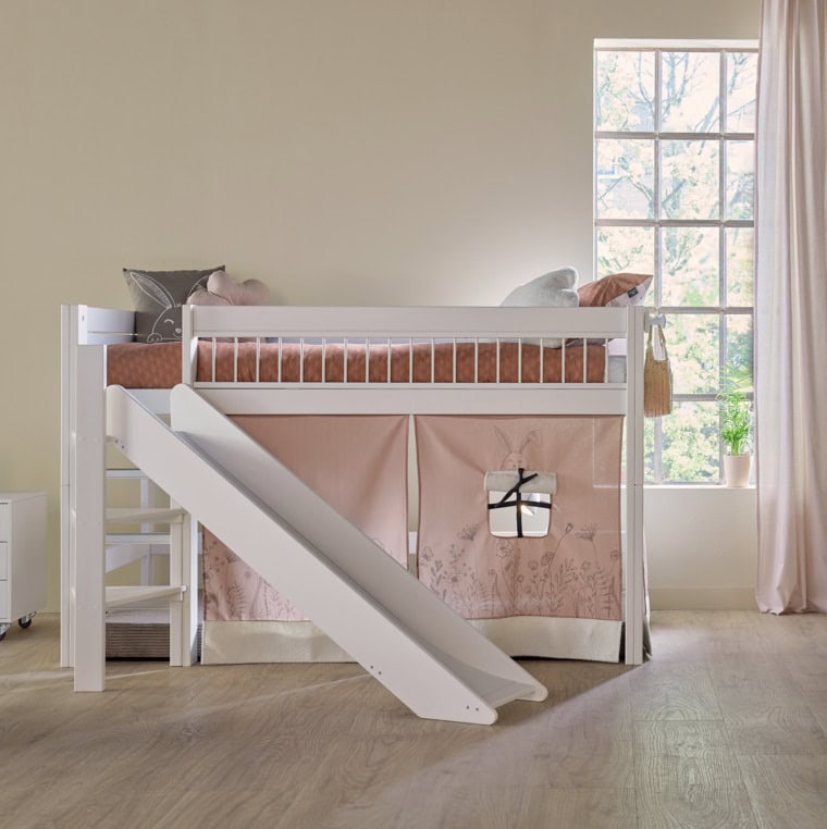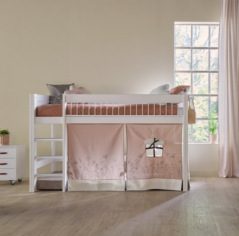 Zavjesa za igranje Happy Rabbit sastoji se od tri platnena panela, koji se spiralnom uzicom pričvršćuju ispod poluvisokog kreveta. Na taj način možete fleksibilno pomicati dijelove zavjese za igru. Zavjesa Vam pomaže stvoriti ugodan prostor za igru ispod kreveta koji poziva svako dijete na igru, sanjarenje i kreativnost. Zemljani i zeleni tonovi lako se kombiniraju s drugim LIFETIME dodacima. Detalji su izrađeni od mekane teddy tkanine.