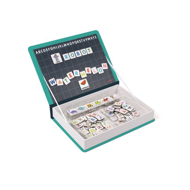 Ova kutija s magnetima sastoji se od 142 magneta s ilustracijama i 116 slova engleske abecede.