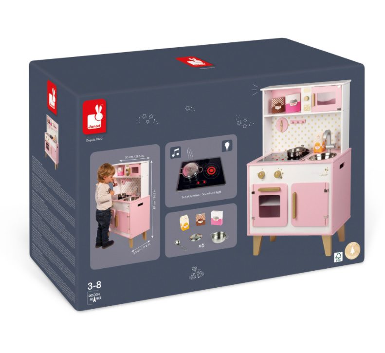 Kao mama i tata, pripremite dobra jela za svoje prijatelje i postanite pravi mali kuhar! Ova sjajna preslatka kuhinja Candy Chic savršeno je opremljena sa tri kukice na koje možemo objesiti kuhinjski pribor, dolazi sa 1 posudom i metalnim poklopcem te sa 3 kartonske kutijice hrane (sok od naranče, kakao, šećer) i sudoperom. Poput prave kuhinje, opremljena je indukcijskom pločom sa zvukom: samo jednom pritisnite crvene tipke da se pločice uključe, a drugi put da čujete zvuk vode. Zvuk i indukcijska ploča automatski se isključuju nakon 30 sekundi ili ako treći put pritisnete crvene tipke. Ova prekrasna, potpuno opremljena kuhinja uključuje i pećnicu, mikrovalnu pećnicu, ormar, 3 okretna gumba sa zvučnim efektima, sudoper od nehrđajućeg čelika i sat. Visina radne ploče: 50 cm.