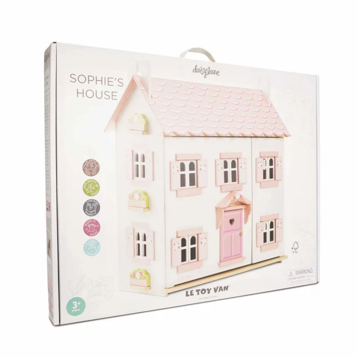 Dječju drvenu kućicu za lutke Sophie čine dva kata i potkrovlje koji su spojeni stepenicama, oslikana je i iznutra i izvana, a svi prozori i vrata na kućici mogu se otvarati.
