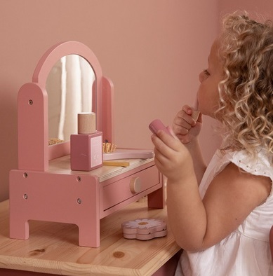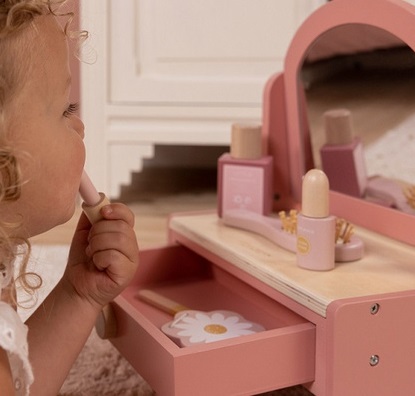 Stol za uljepšavanje ima okretno ogledalo i niz kozmetičkih proizvoda, uključujući četku za kosu, parfem, ruž za usne, sjenilo, turpiju za nokte i lak za nokte.