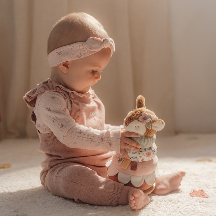 Slaganje mekanih i šarenih prstenova na drvenu podlogu Fairy Garden koja se ljulja naprijed-natrag pravi je izazov. Ipak, simpatična srna potiče mališane da se što više potrude i da ne odustanu. Svaki prsten ima jedinstven dizajn inspiriran novom kolekcijom Fairy Garden. Neka avantura slaganja počne!