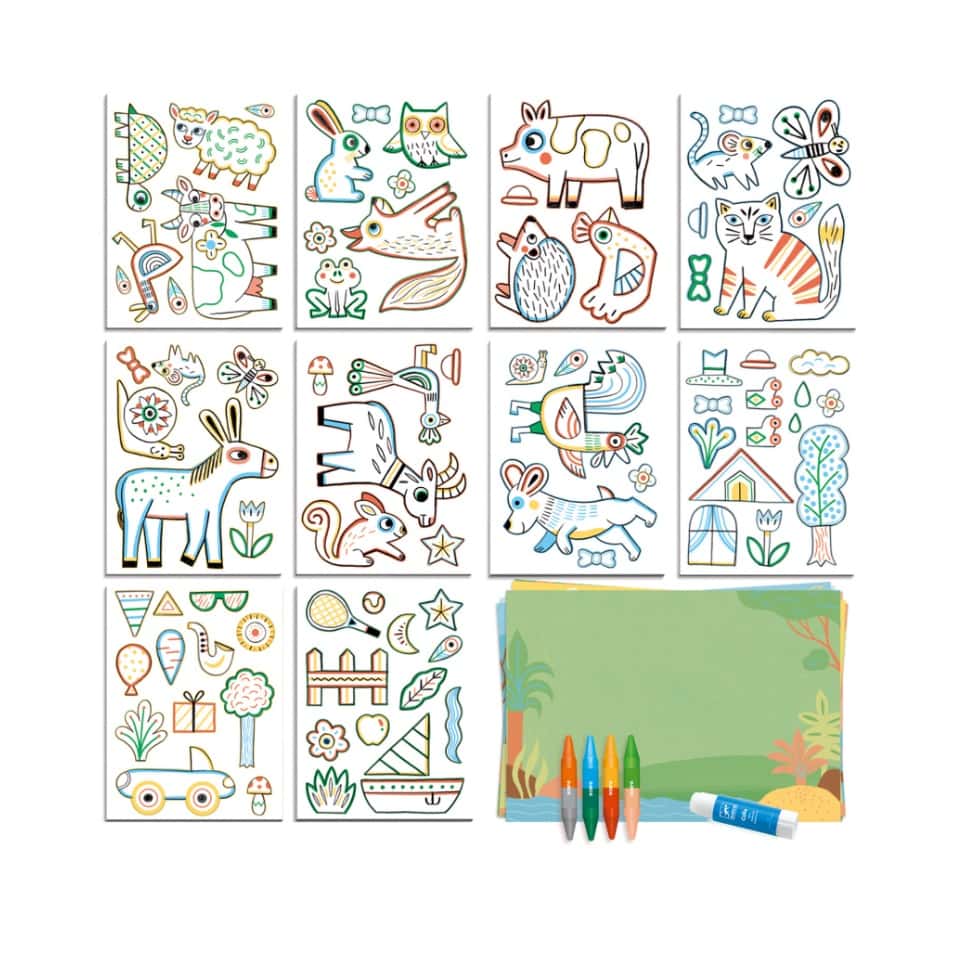 Kreativni set – Životinje dolazi s raznolikim čvrstim kartonskim oblicima, idealnim za bojanje i lijepljenje na 6 različitih scena. Svaka scena oživljava svijet životinja na jedinstven način, potičući maštovite priče i igru.