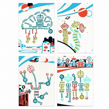 Kombiniraj različite boje i oblike te dovrši slike s temom svemira i robota.