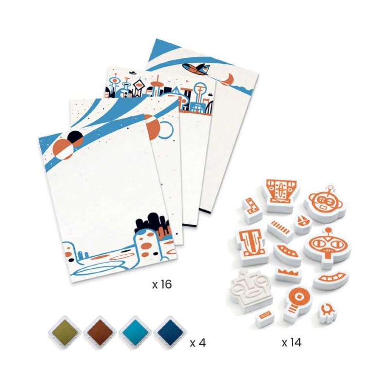 U setu se nalazi 16 kartica (15 x 21 cm) koje je potrebno dovršiti, 14 štambilja, 4 različite boje tinte i knjižica s uputstvima.