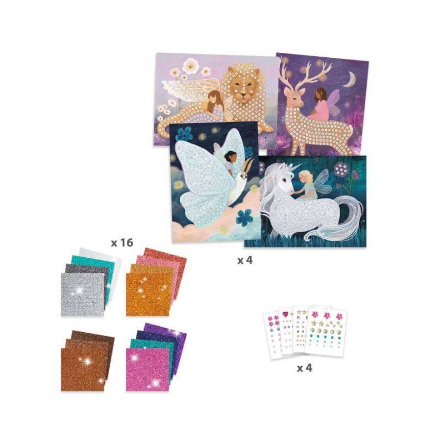Sadržaj seta: 4 ilustrirane kartice, 16 listova ljepljivih svjetlucavih pjenastih kvadrata, 4 lista ljepljivih kamenčića, 1 knjižica s uputama korak po korak u boji.