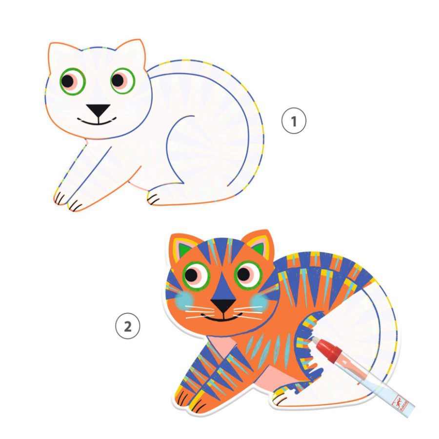 Sadrži 4 slike za bojanje na mekanim plastičnim pločama (s bijelim područjima koja nestaju), olovku sa spremnikom za vodu i stalak od kartona