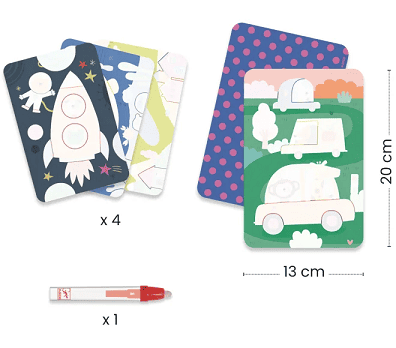 U pakiranju ćete pronaći 4 različite kartice za bojanje s priloženom magičnom olovkom.